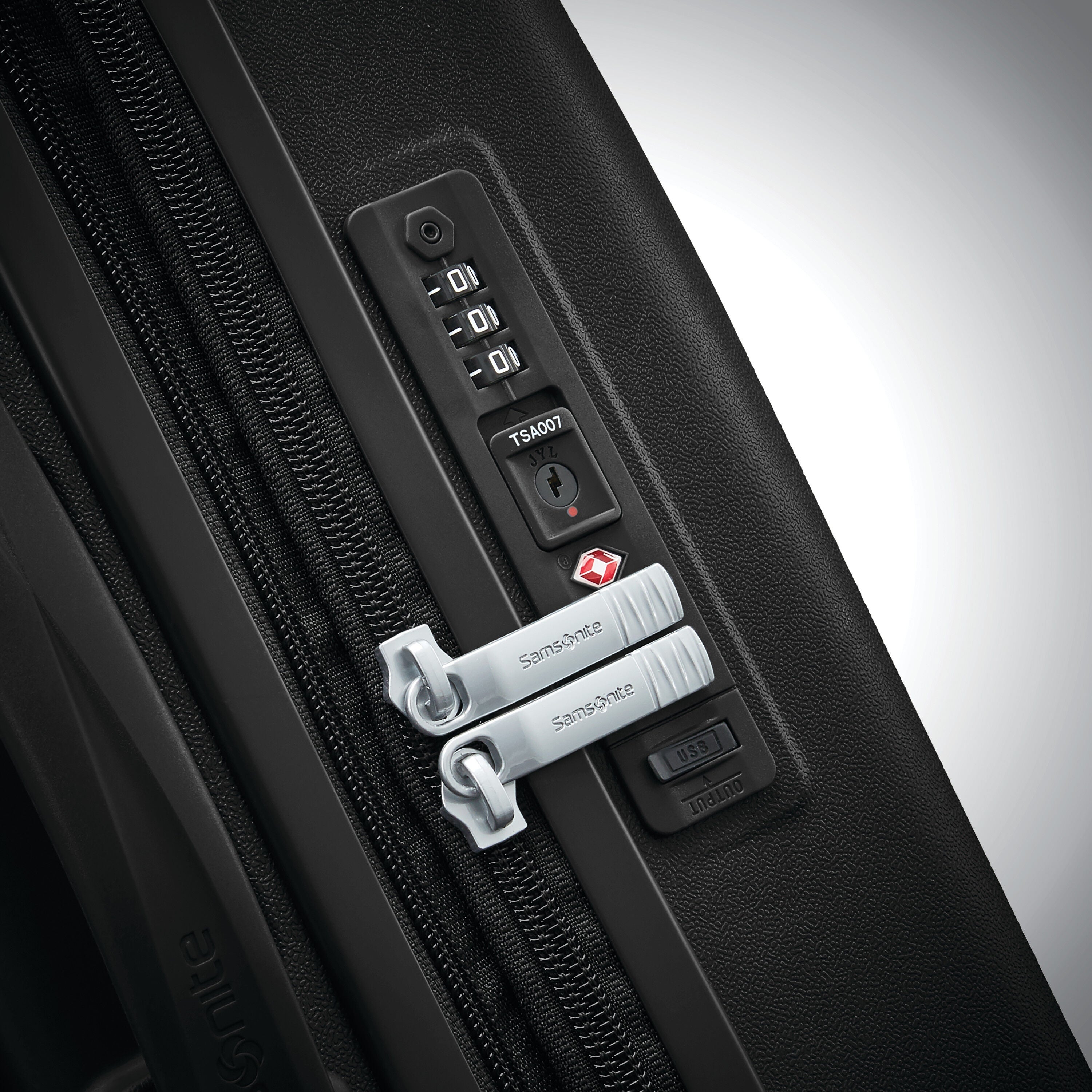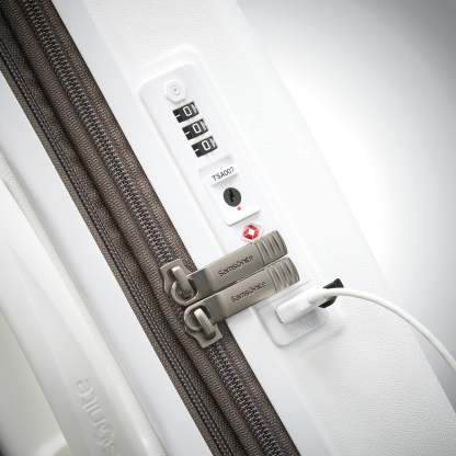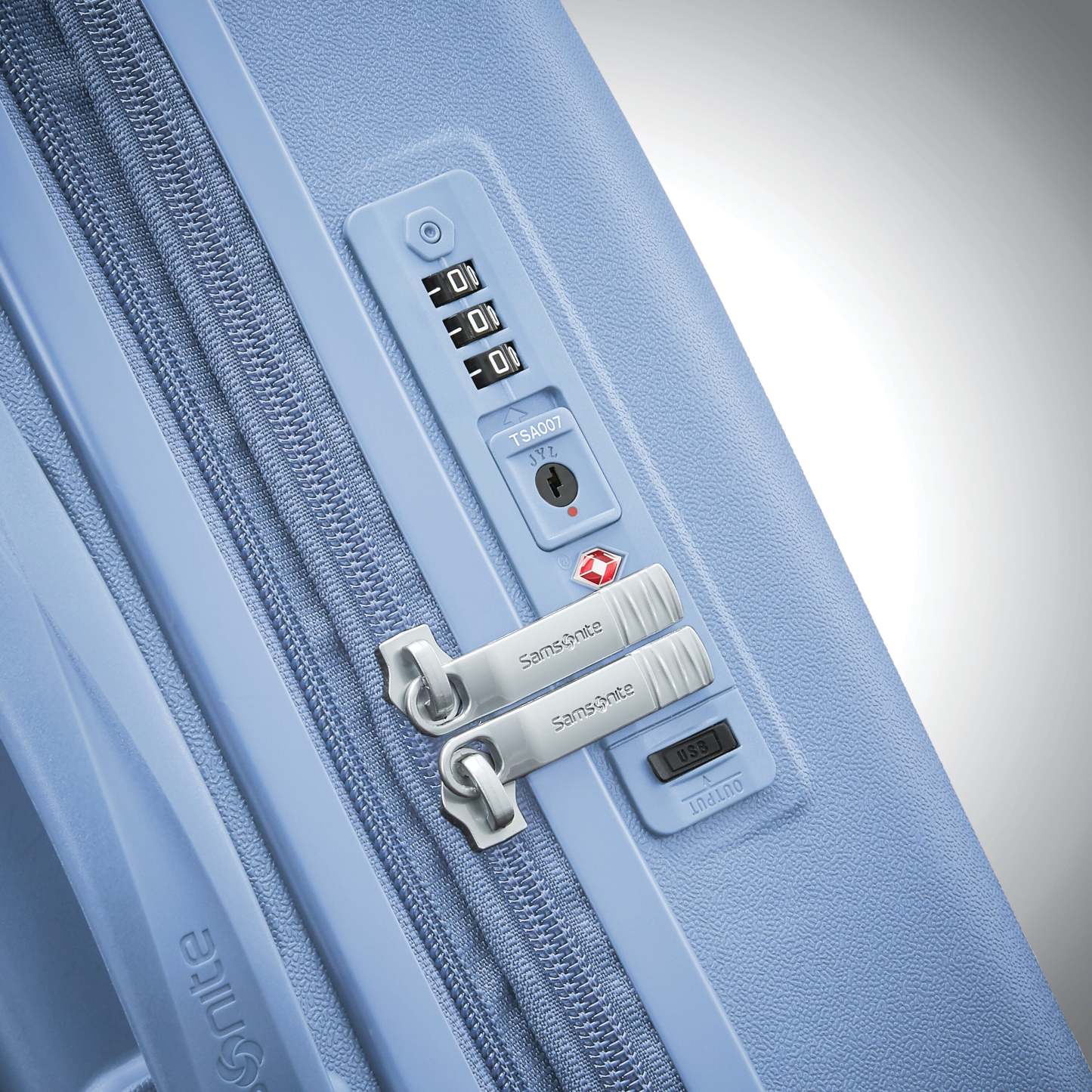 - USB port with protective cover integrates into the TSA-approved lock panel for streamlined design and charging convenience (battery not included)