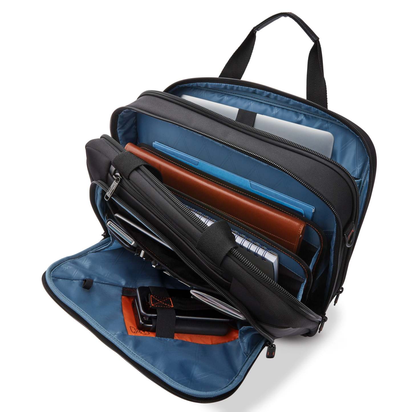The sleek modern design of this sathtmsonite Pro Double Compartment Brief doesn't skimp on features. Fully loaded with tech upgrades like wireless charging, RFID protection and USB ports for on-the-go-charging. Features also include laptop compartment and tablet sleeve , along with premium business organization. This brief carries your belongings safely in style.