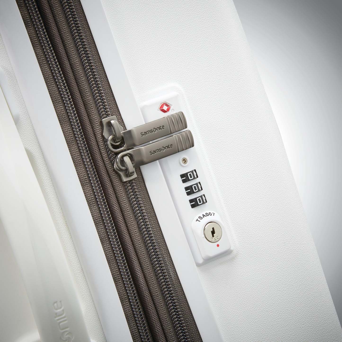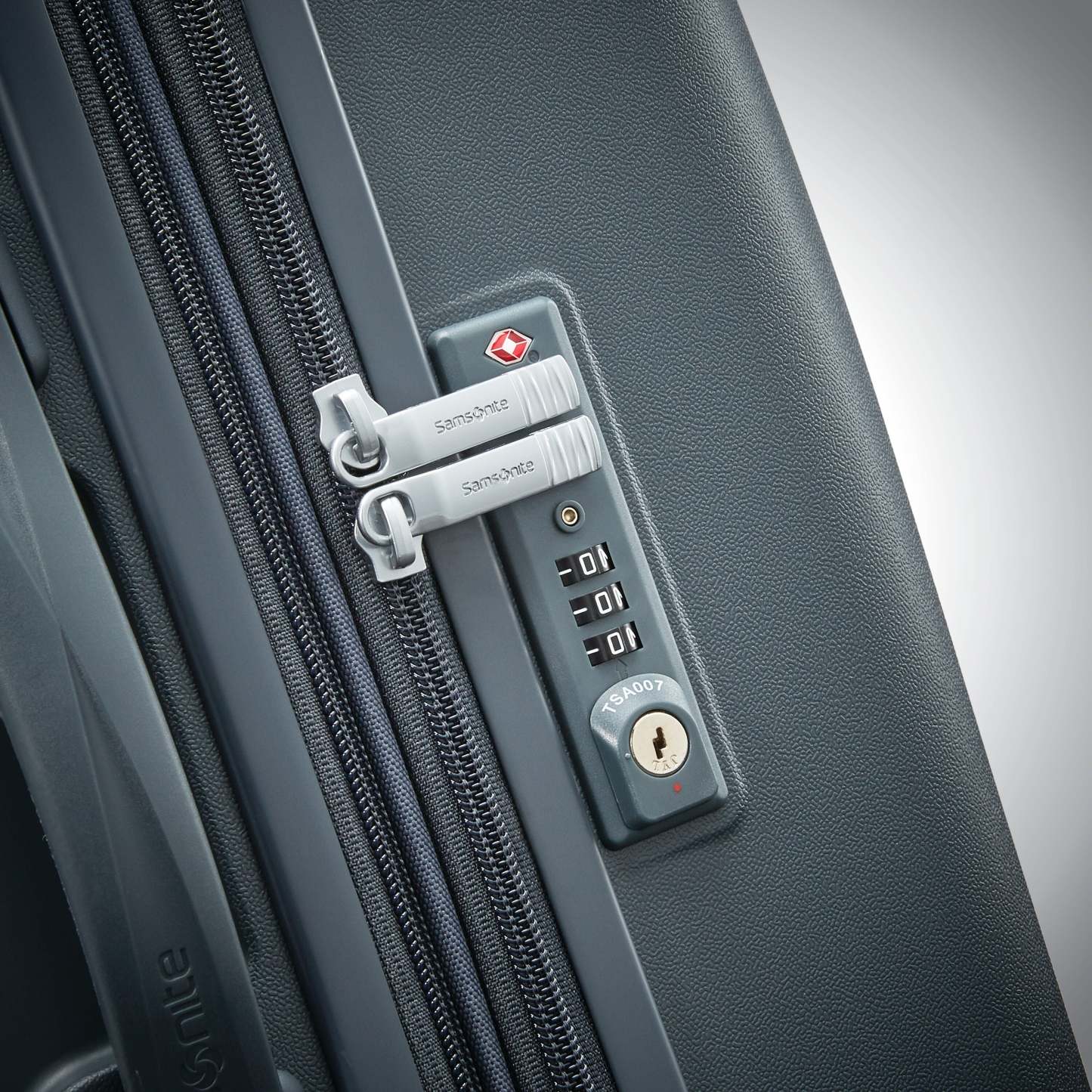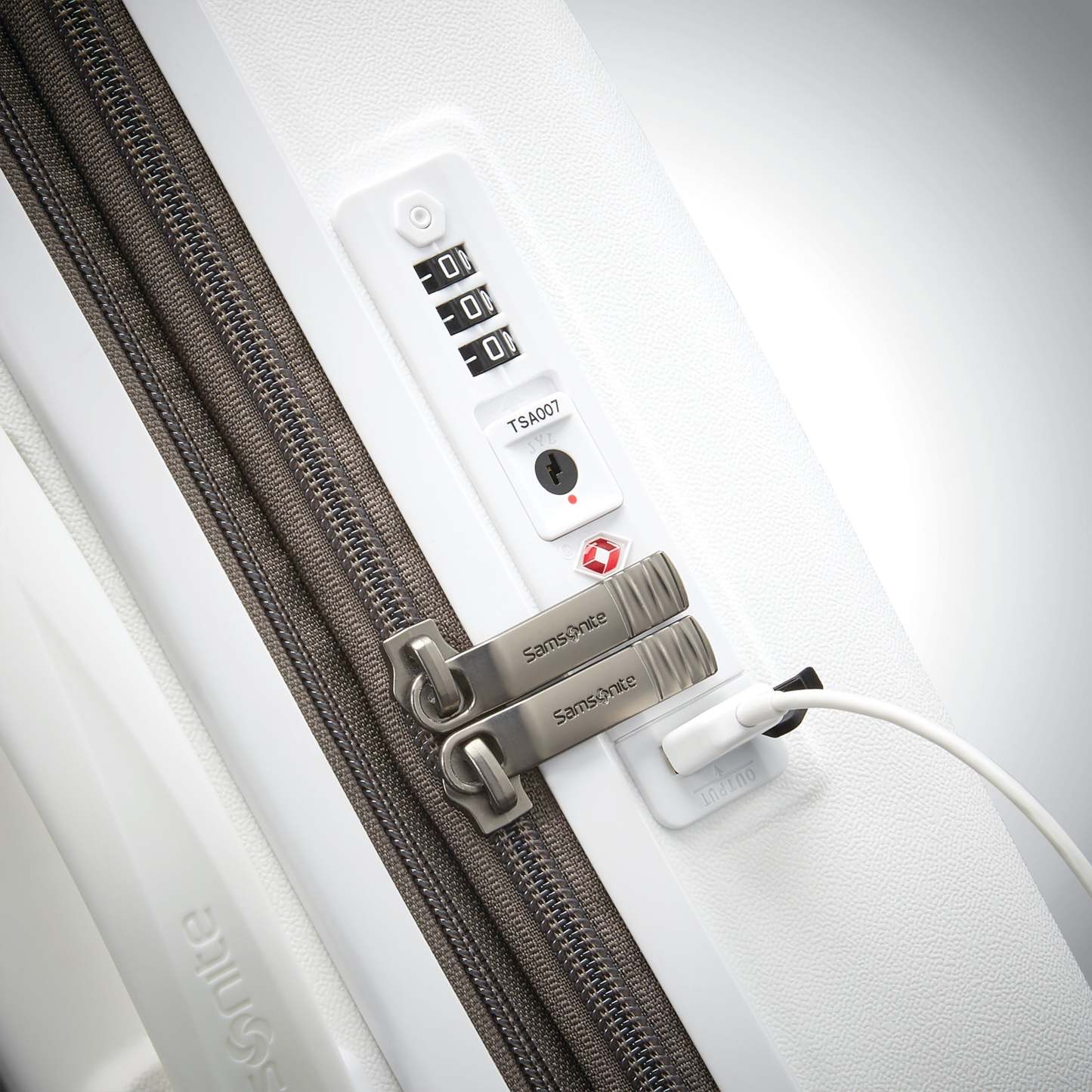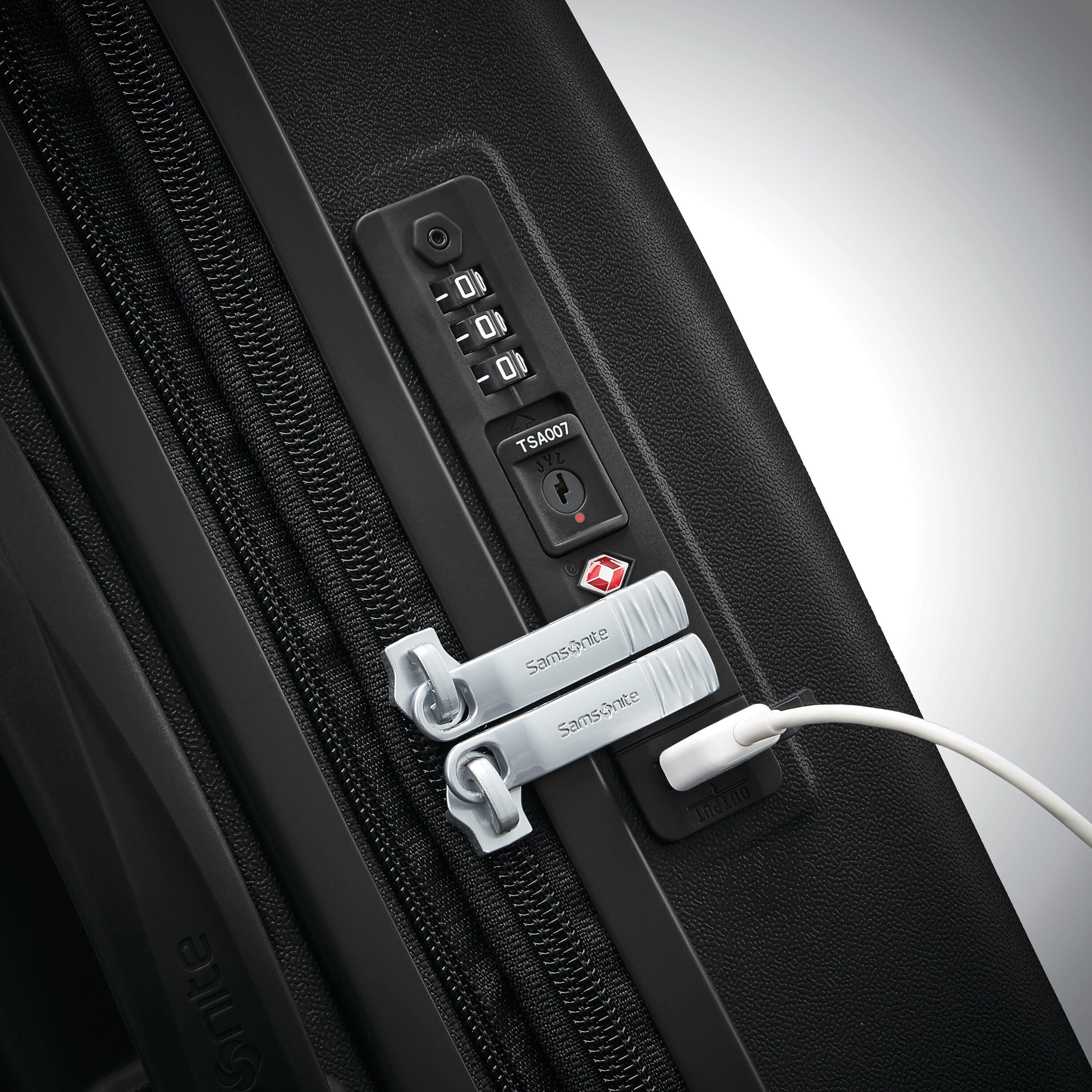 - USB port with protective cover integrates into the TSA-approved lock panel for streamlined design and charging convenience on the Carry-On (battery not included)