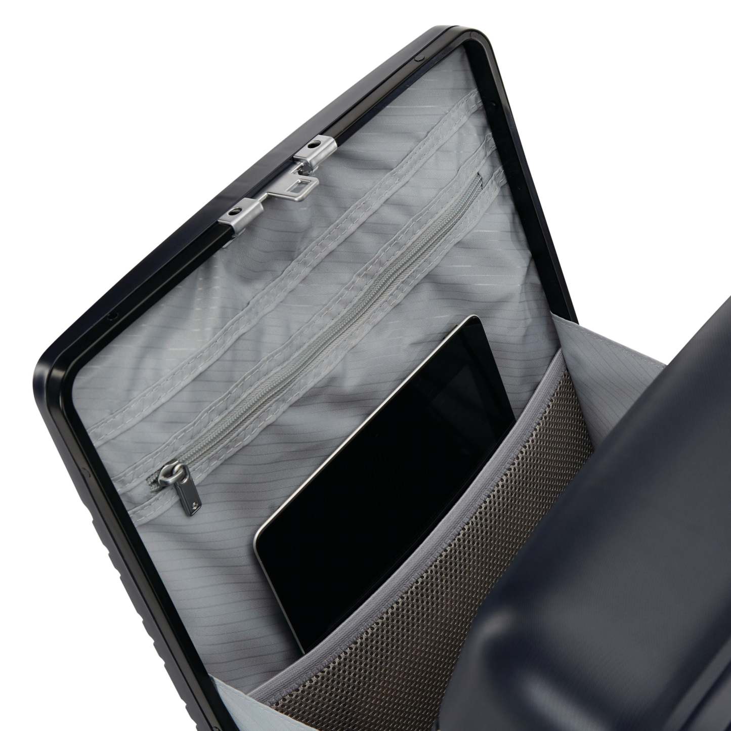- The back side of the interior packing section features a dedicated garment compartment